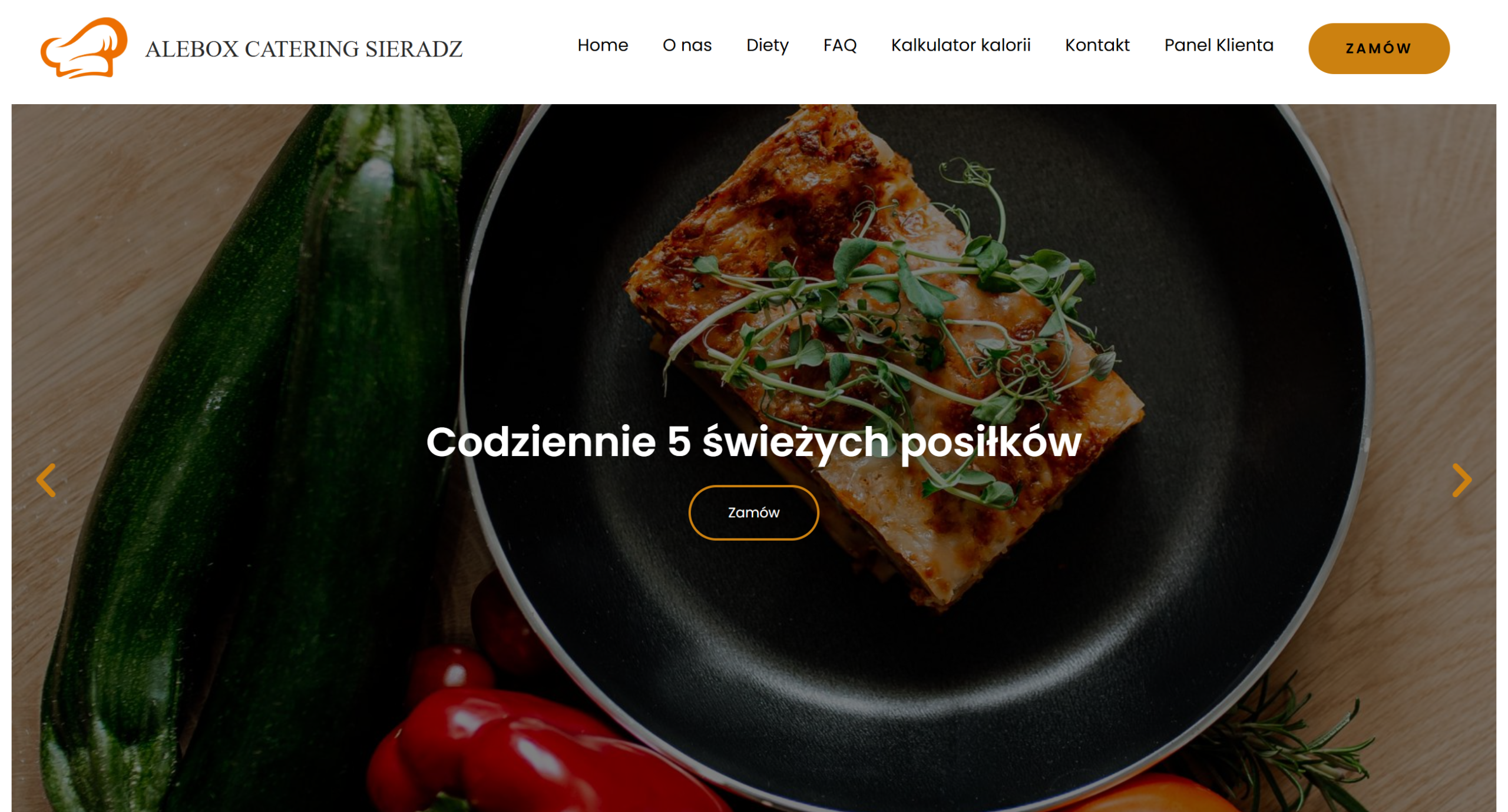 Strona dla firmy dietetycznej, prezentująca ofertę, opinie klientów oraz kalkulator żywieniowy w lekkim i profesjonalnym stylu.