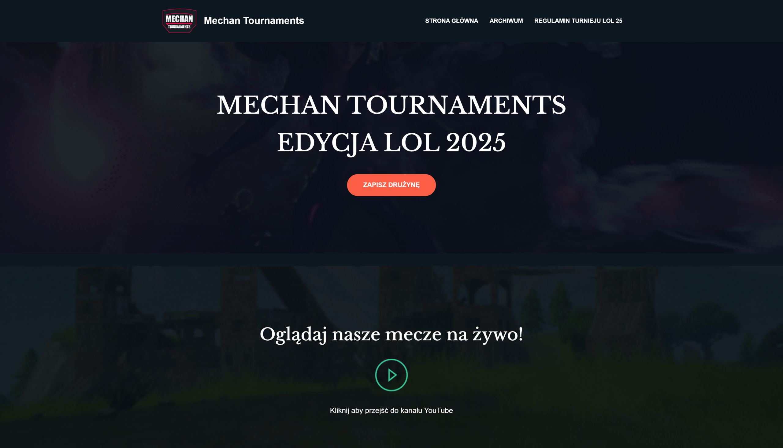 Strona dla organizacji e-sportowych turniejów, prezentująca wydarzenia, zapisy, harmonogram oraz wyniki rozgrywek w grach takich jak CS, League of Legends, FIFA i Fortnite.